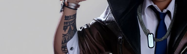 Llevo los restos del sistema que intentó moldearme, solo para recordarme lo que he escapado. Todo lo que está más allá del torso se convierte en pintura de guerra, poesía, armadura y caos. No soy un número. Soy un personaje silencioso de la revolución.